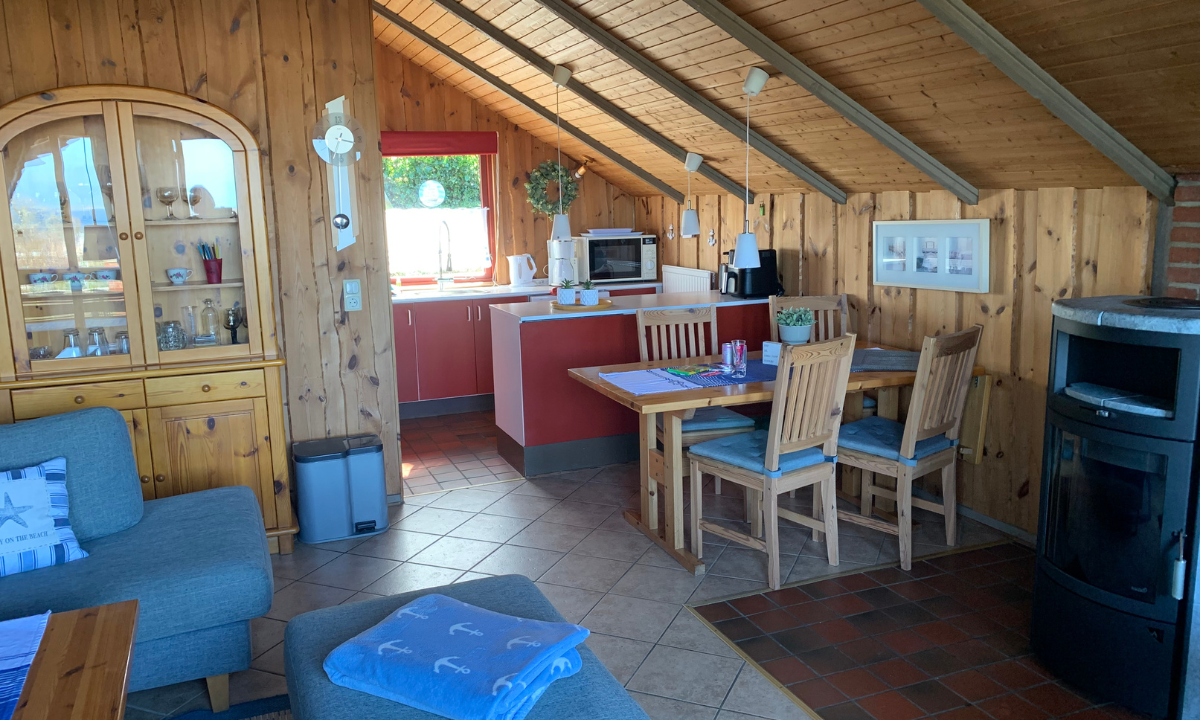 Das gemütliche Wohnzimmer verfügt über eine einladende Eckgarnitur, einen Kaminofen sowie einen hellen Essbereich mit direktem Zugang zum großzügigen Balkon. Von hier aus genießen Sie einen wunderschönen Blick auf die Ostsee. Der Balkon ist vollständig möbliert und zusätzlich mit einem Holzkohlegrill ausgestattet. Auf dem Grundstück steht außerdem ein Strandkorb zur Verfügung, der entspannte Stunden mit Meerblick ermöglicht.
