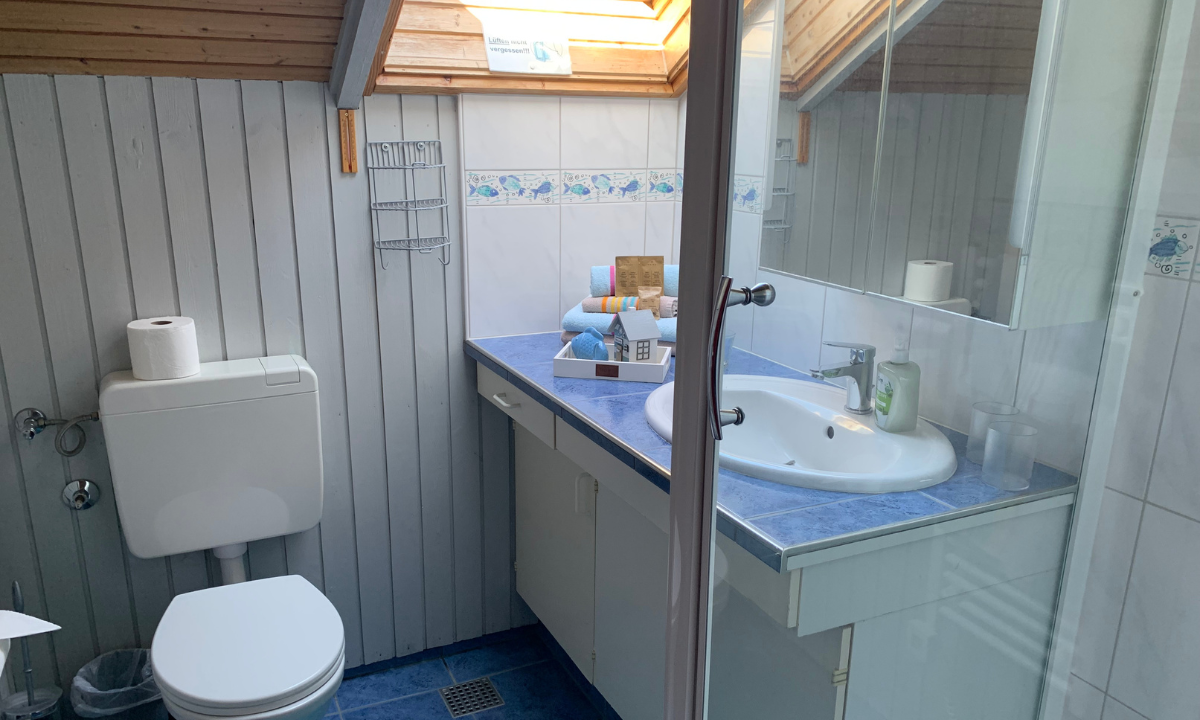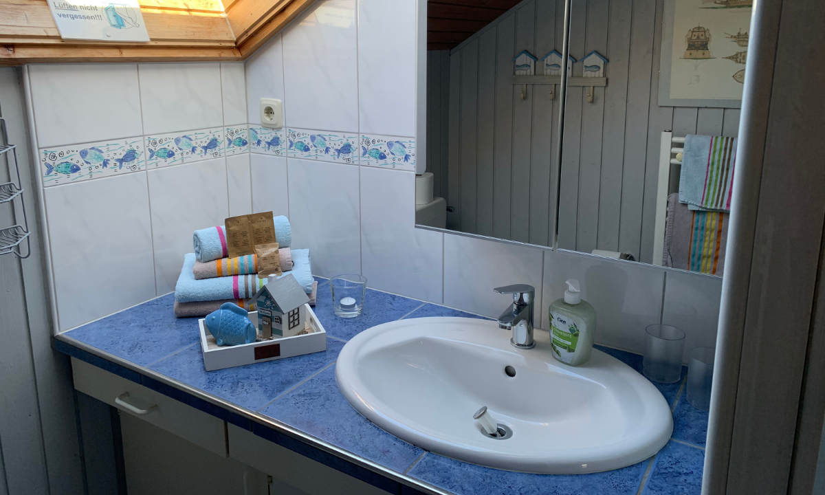 Das Badezimmer ist hell und freundlich gestaltet und verfügt über ein Tageslichtfenster sowie eine Dusche. Die offene Küche schließt direkt an den Wohn und Essbereich an und ist mit einer Geschirrspülmaschine, einem Induktionsherd und einem Backofen ausgestattet. Sie bietet alles, was für eine komfortable Selbstversorgung im Urlaub benötigt wird.