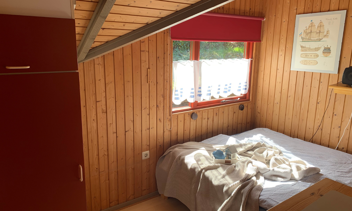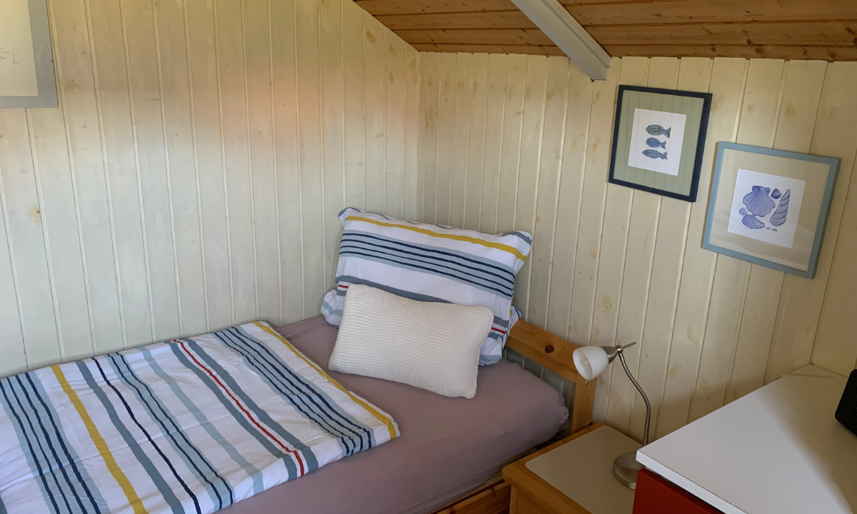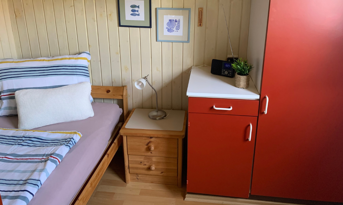 Das Ferienhaus verfügt insgesamt über drei Schlafzimmer. Zwei Zimmer sind jeweils mit einem Einzelbett und ausreichend Stauraum ausgestattet, während das dritte Schlafzimmer ein französisches Bett sowie ebenfalls Schrankplatz bietet.