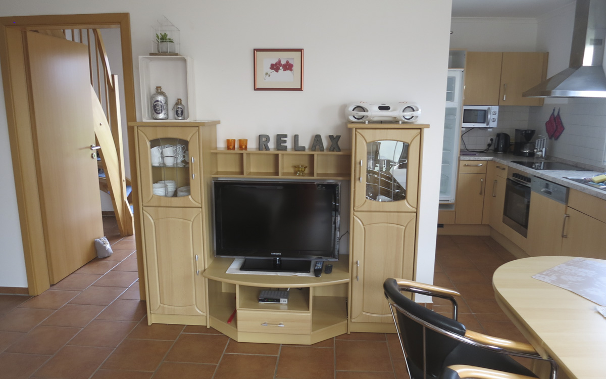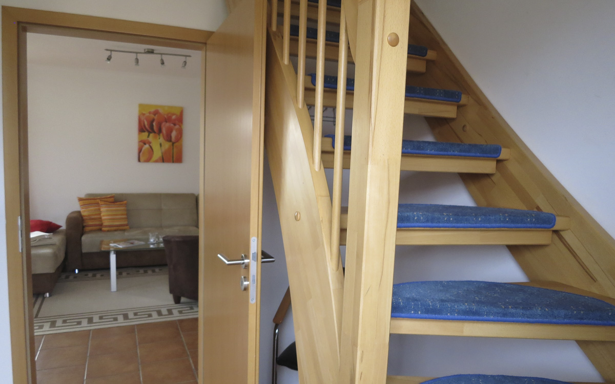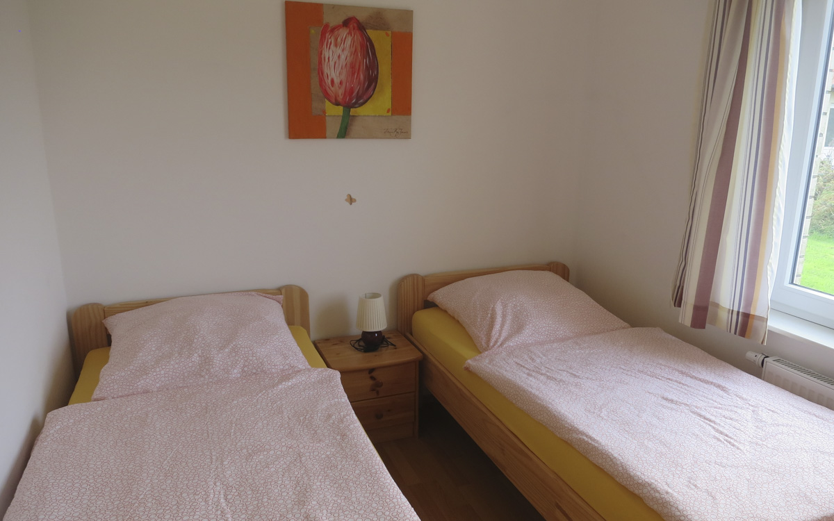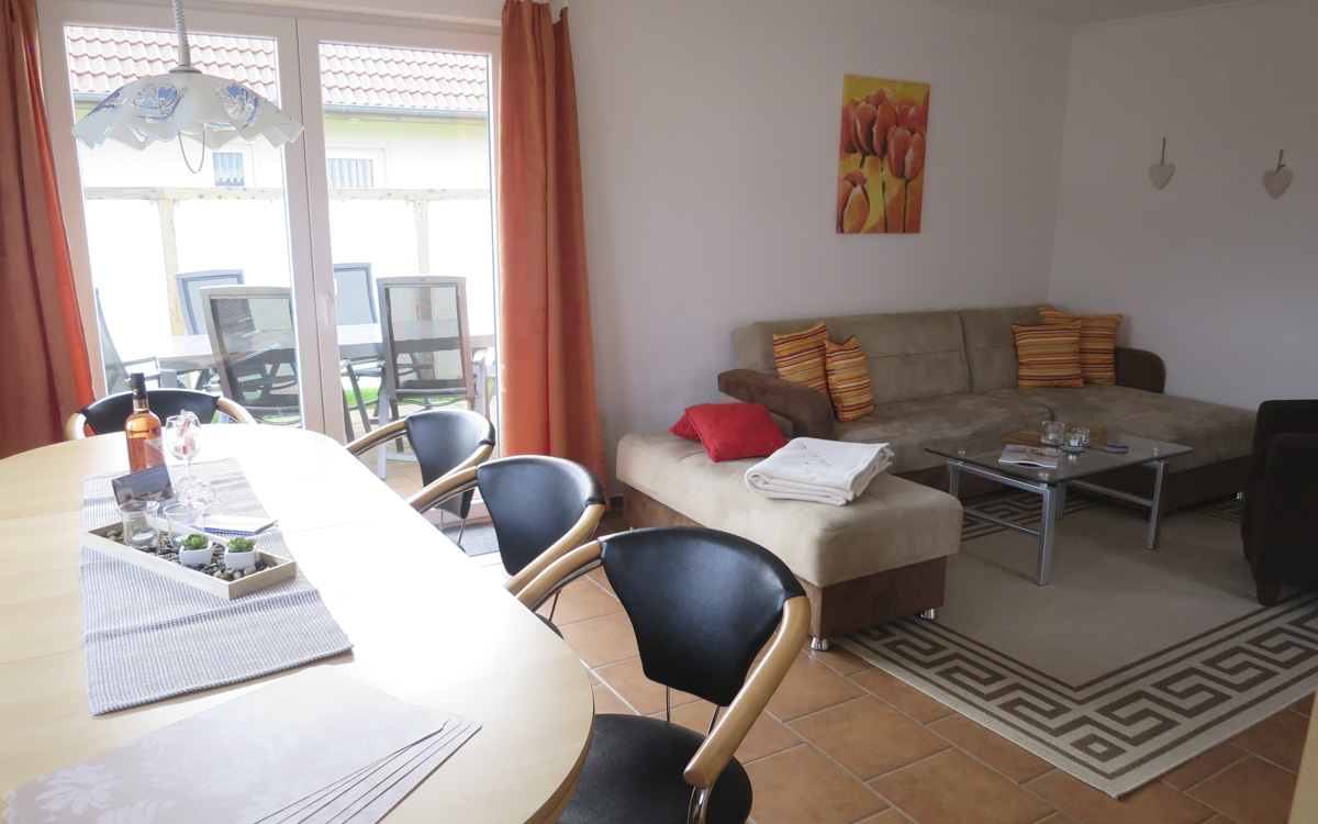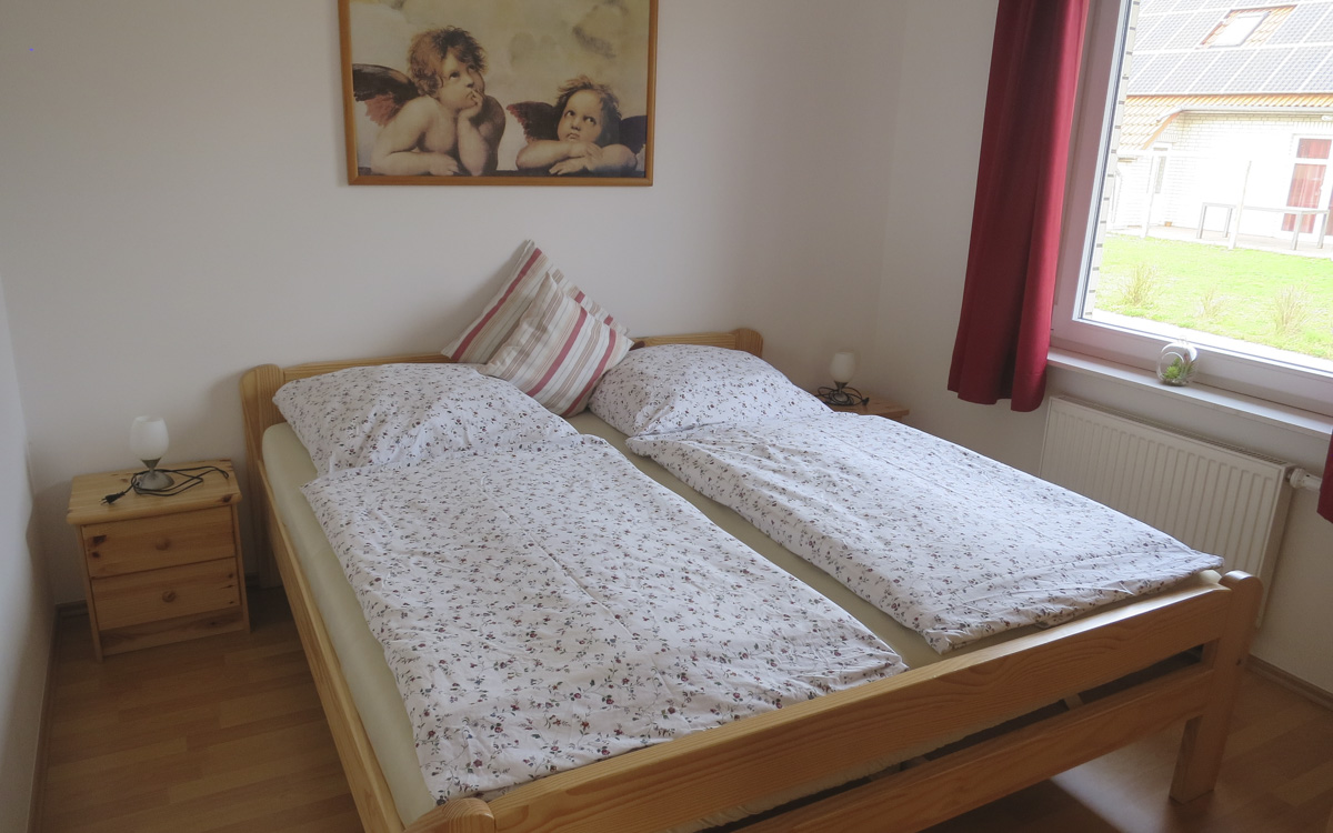 Das Ferienhaus erstreckt sich über zwei Wohnebenen mit einem großen Wohnbereich im Erdgeschoß. Hier befindet sich eine gemütliche Sitzecke, ein Essbereich und die offene Küche mit Geschirrspülmaschine. Der Wohnbereich ist mit einem LCD TV ausgestattet. Vom Wohnbereich gelangt man auf die große Terrasse mit Gartenmöbeln, Grill und Sonnenschirm. Zwei Schlafzimmer für jeweils zwei Personen befinden sich ebenfalls im Erdgeschoß. Auch das Duschbad mit Waschmaschine ist im Erdgeschoß. Im Flur, über eine Holztreppe, betritt man den oberen Wohnbereich mit ebenfalls zwei Schlafzimmern für jeweils zwei Personen und ein weiteres Duschbad. An der Terrasse befindet sich noch ein zusätzlicher Hauswirtschaftsraum. Hier können auch Fahrräder oder Kinderwagen eingestellt werden.