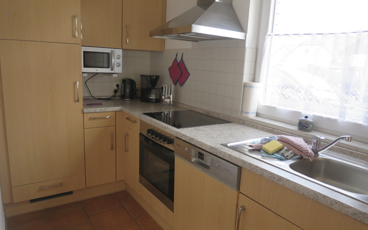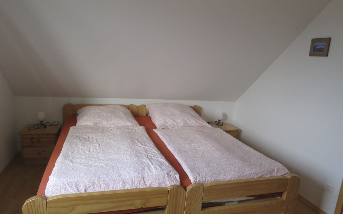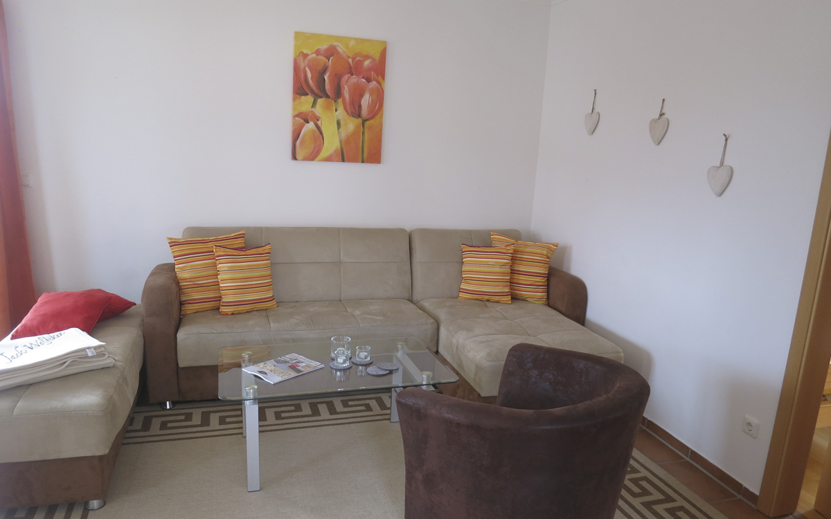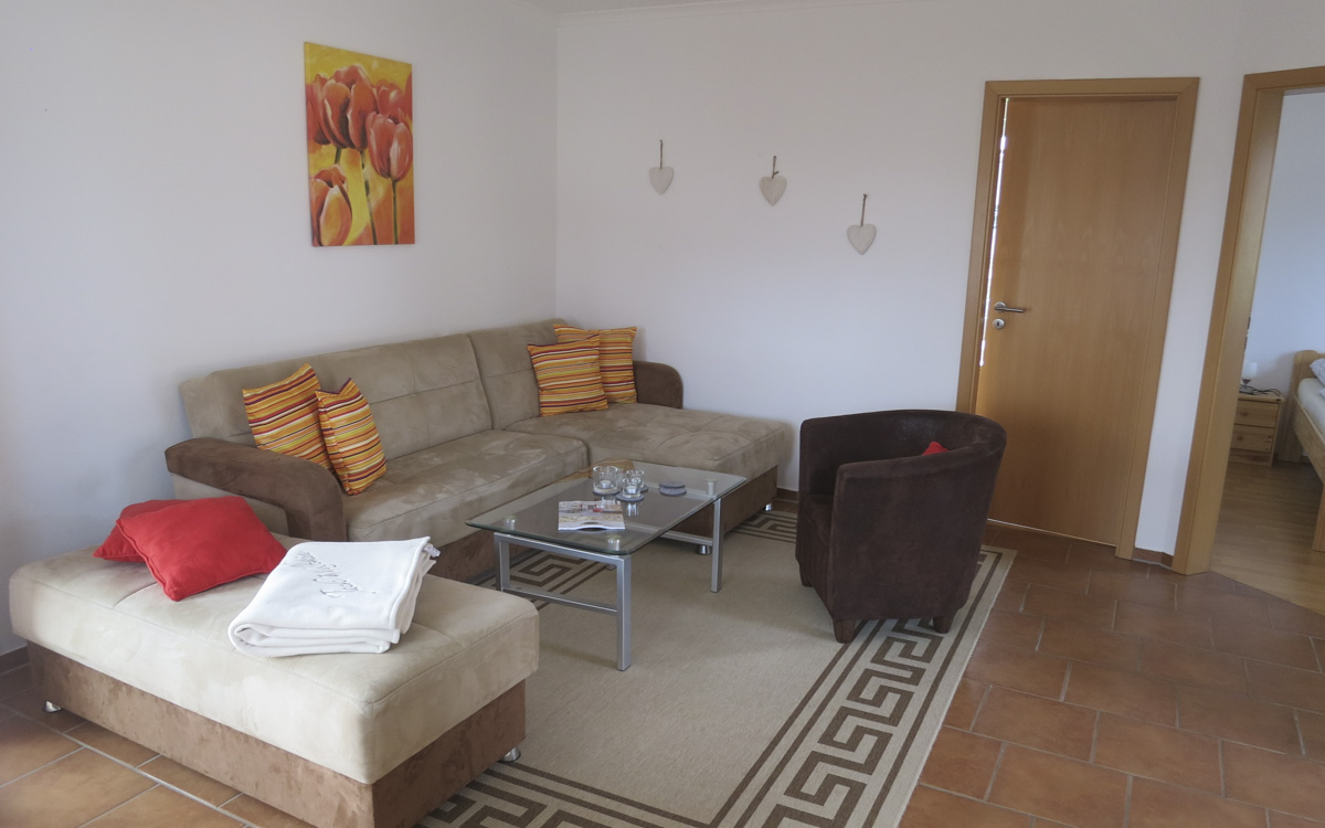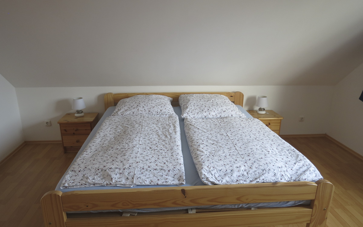 Das Ferienhaus erstreckt sich über zwei Wohnebenen mit einem großen Wohnbereich im Erdgeschoß. Hier befindet sich eine gemütliche Sitzecke, ein Essbereich und die offene Küche mit Geschirrspülmaschine. Der Wohnbereich ist mit einem LCD TV ausgestattet. Vom Wohnbereich gelangt man auf die große Terrasse mit Gartenmöbeln, Grill und Sonnenschirm. Zwei Schlafzimmer für jeweils zwei Personen befinden sich ebenfalls im Erdgeschoß. Auch das Duschbad mit Waschmaschine ist im Erdgeschoß. Im Flur, über eine Holztreppe, betritt man den oberen Wohnbereich mit ebenfalls zwei Schlafzimmern für jeweils zwei Personen und ein weiteres Duschbad. An der Terrasse befindet sich noch ein zusätzlicher Hauswirtschaftsraum. Hier können auch Fahrräder oder Kinderwagen eingestellt werden.