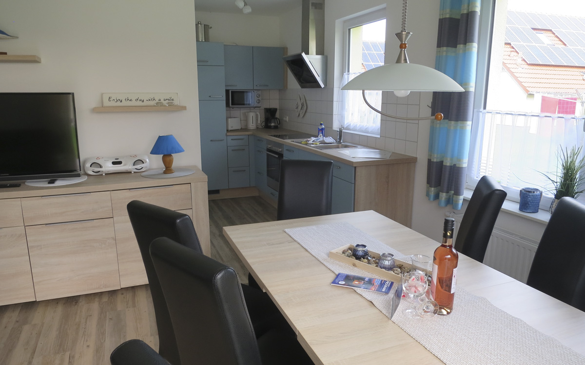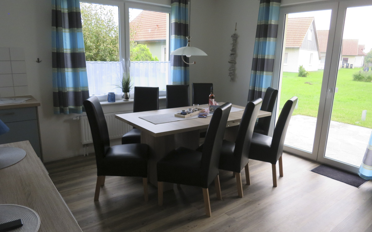 Dieses Ferienhaus bietet Platz auf 110qm für 2-8 Personen. Im Erdgeschoß befindet sich ein helles Esszimmer mit gemütlicher Sitzecke und LCD TV (Satelliten-Empfang).