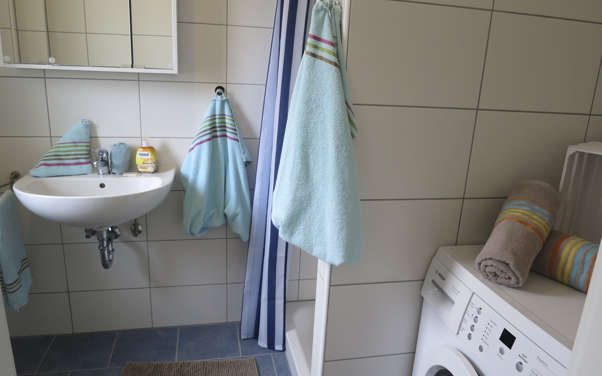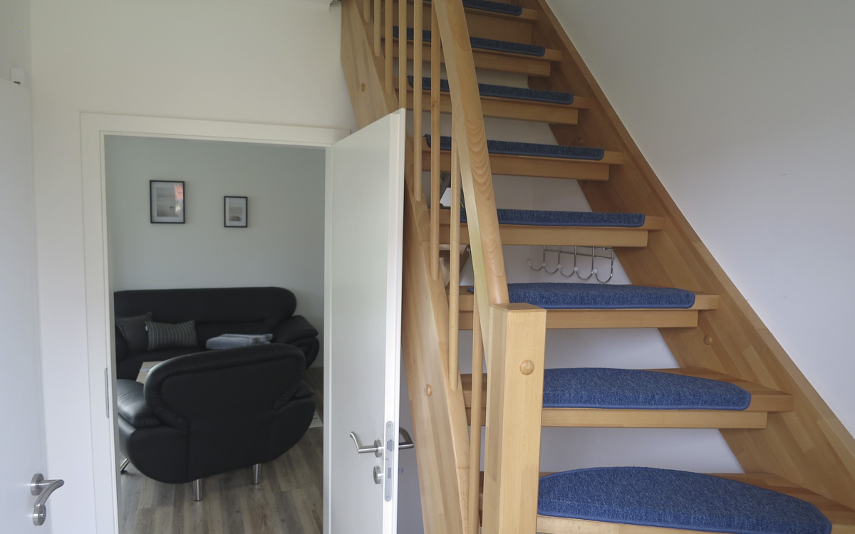 Auch der große Essbereich befindet sich im Wohnbereich und grenzt an die offene und voll ausgestattete Küche mit Geschirrspülmaschine. An den Wohnbereich grenzt die große Terrasse mit Gartenmöbeln, Grill und Sonnenschirm. Zwei Schlafzimmer für je 2 Personen und das Duschbad mit Waschmaschine befinden sich ebenfalls im Erdgeschoß. Über eine massive Holztreppe gelangt man in den 1. Stock. Hier sind ebenfalls 2 Schlafzimmer für je 2 Personen und ein weiteres Duschbad untergebracht. Alle Räume sind hell und gemütlich eingerichtet. An der Terrasse befindet sich noch ein zusätzlicher Hauswirtschaftsraum. Hier können auch Fahrräder oder Kinderwagen eingestellt werden.