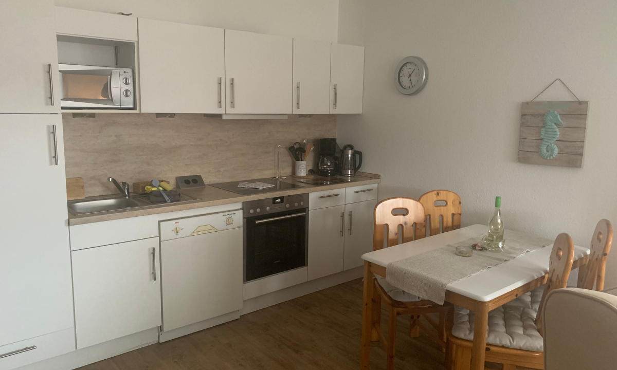 Die großzügige Küchenzeile ist vollständig ausgestattet und bietet alles, was Sie für die Zubereitung Ihrer Mahlzeiten benötigen.