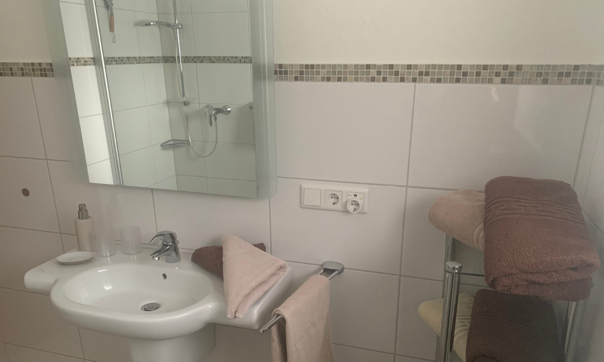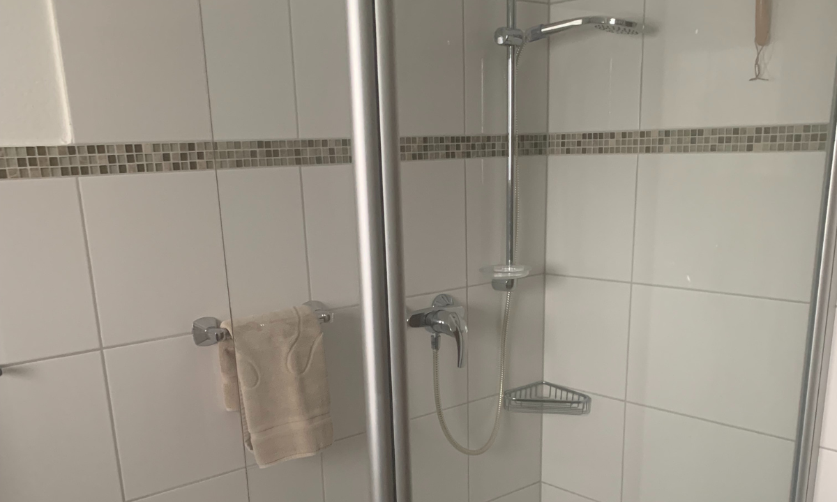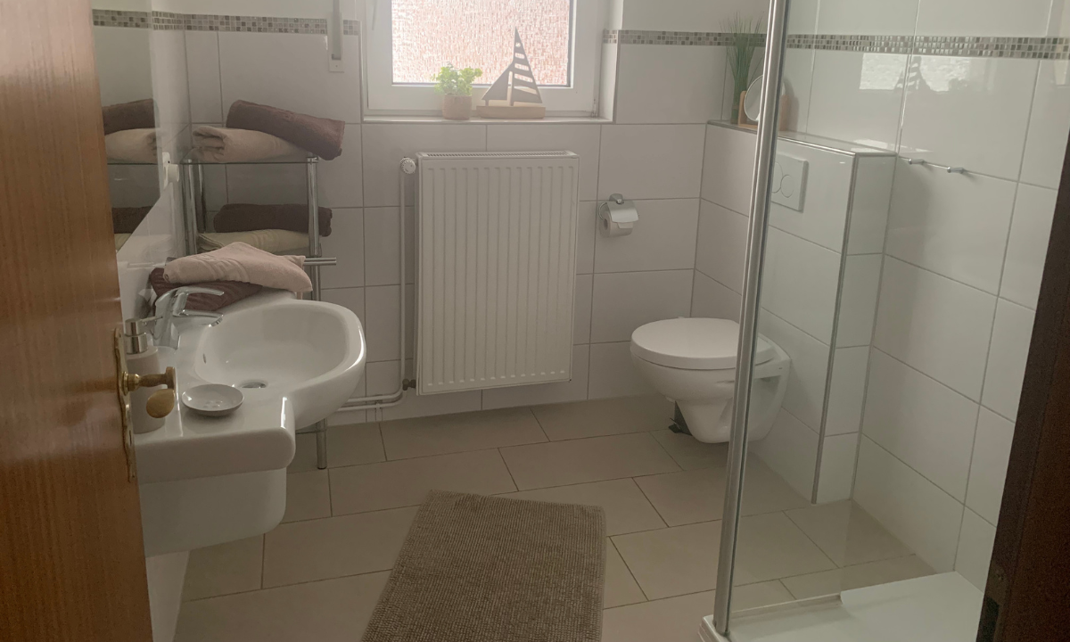 Das moderne Badezimmer verfügt über eine flache Duschtasse mit Glasduschkabine und bietet ausreichend Platz für einen angenehmen Start in den Tag.