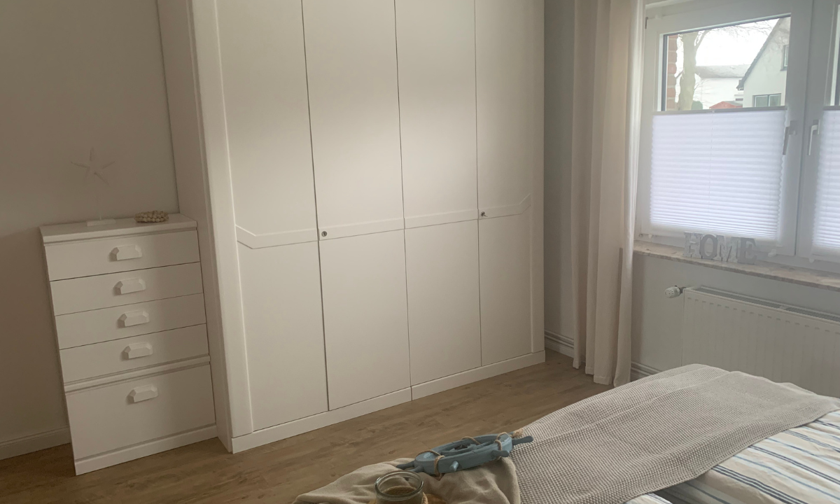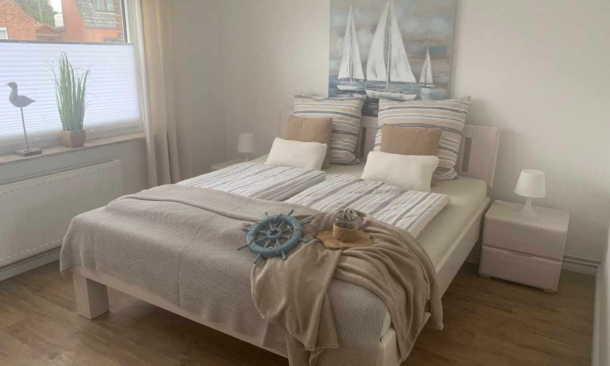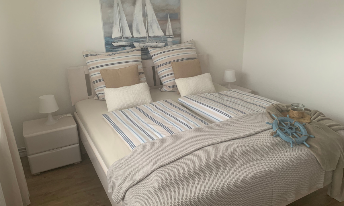 Das Schlafzimmer ist mit einem komfortablen Bett in der Größe 1,80 x 2,00 Meter eingerichtet.